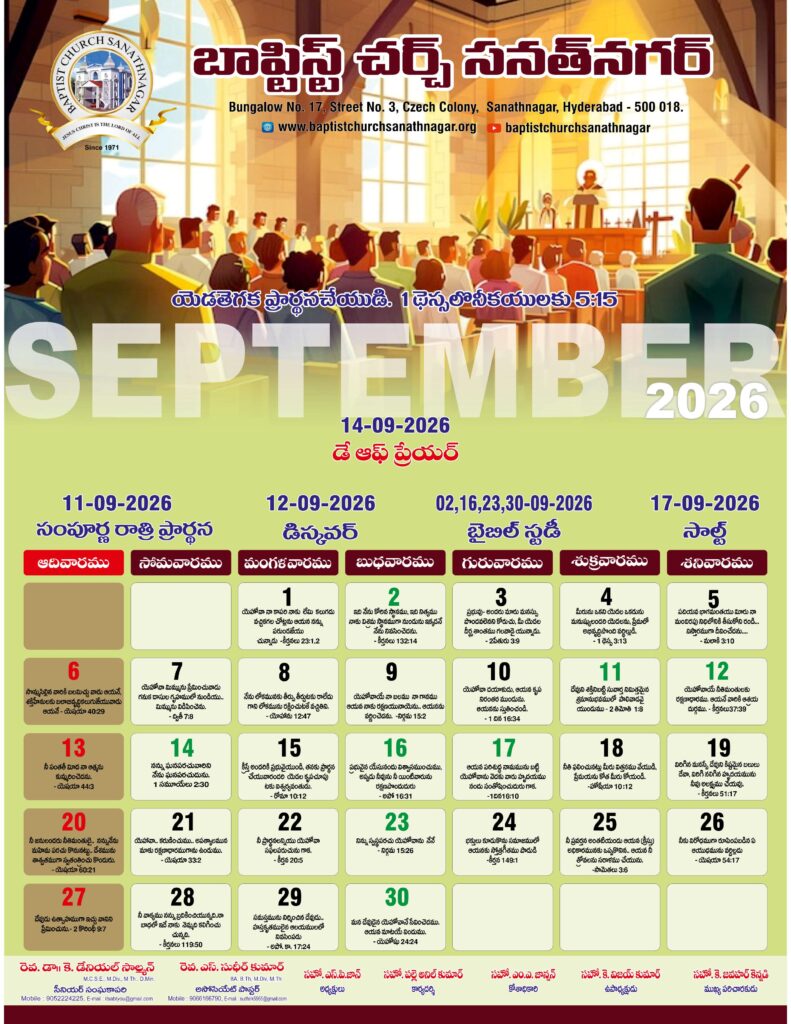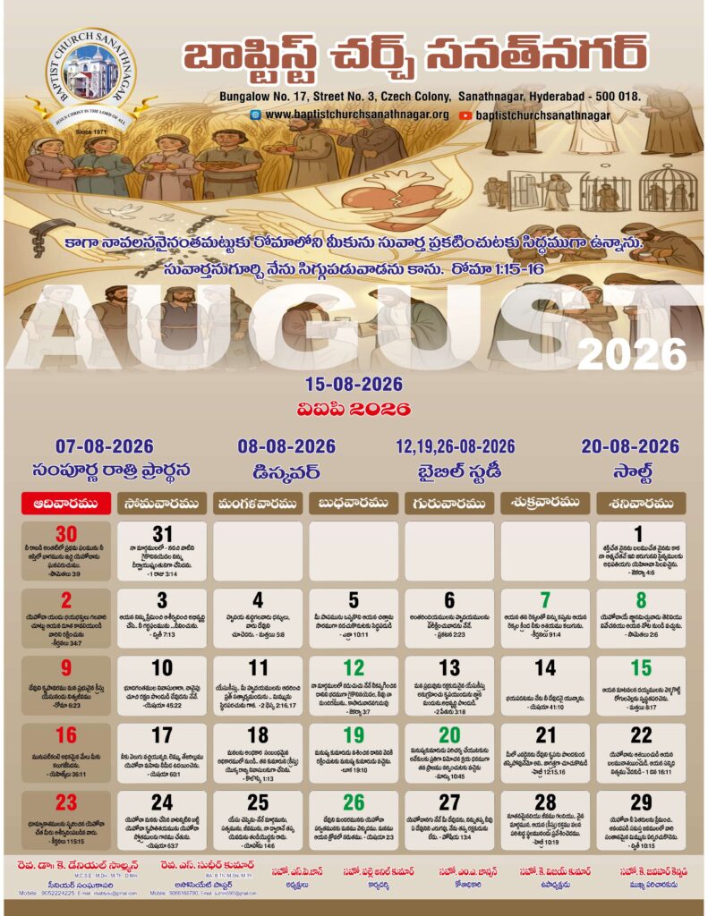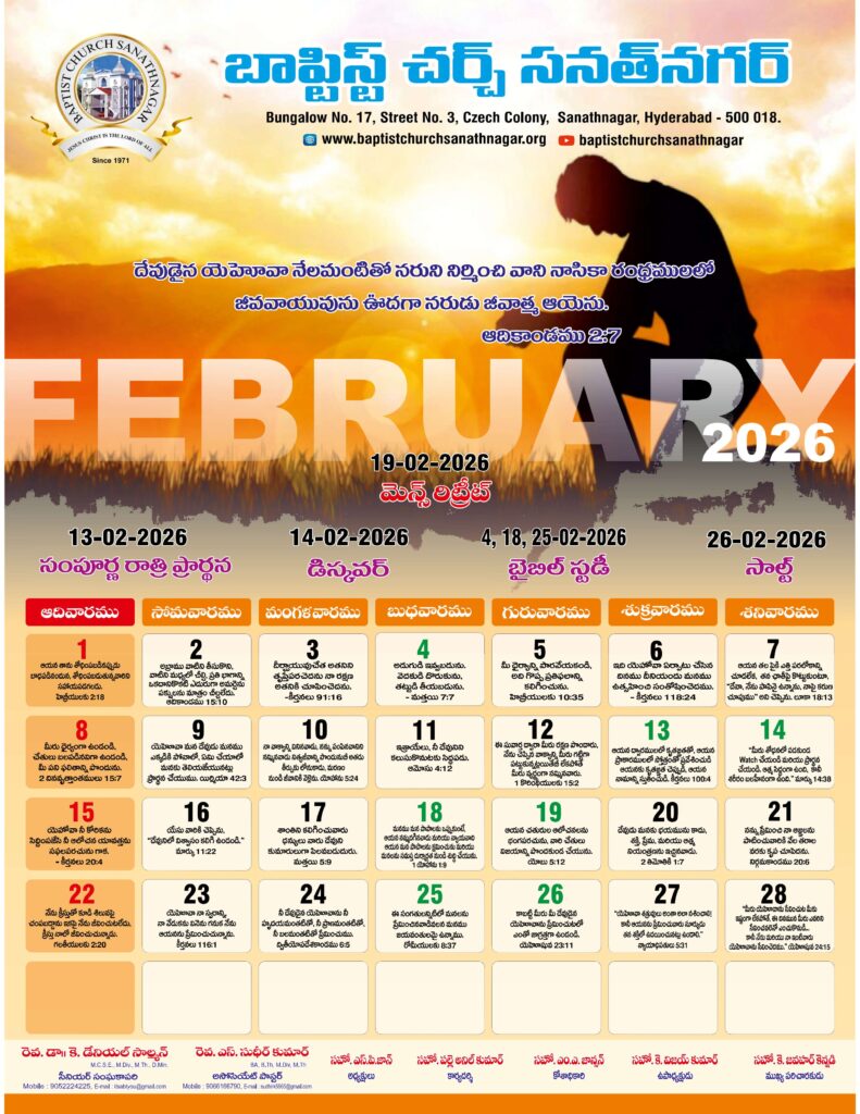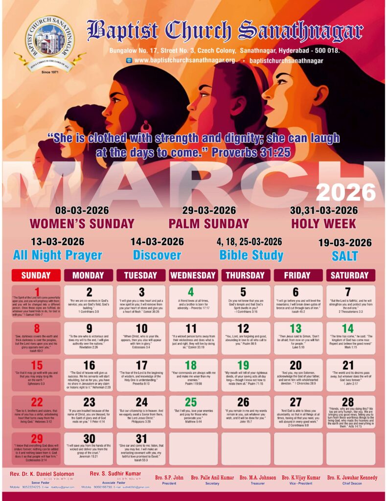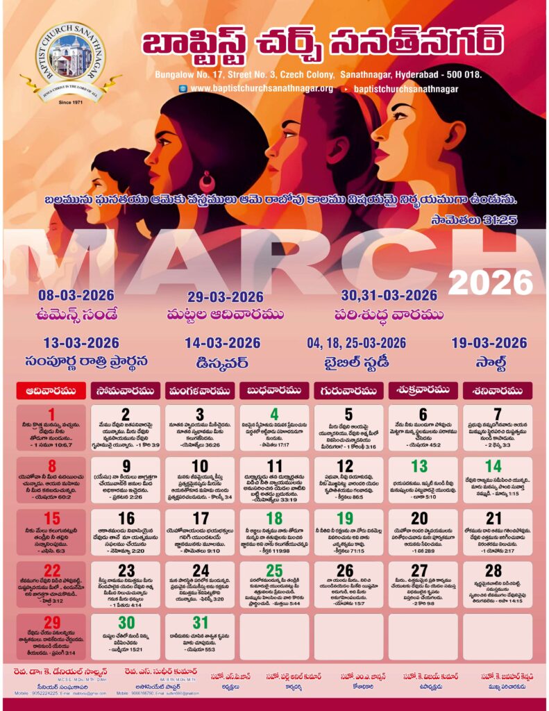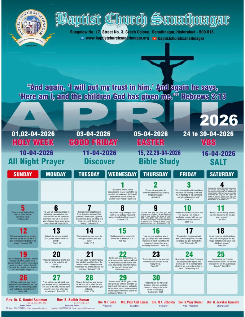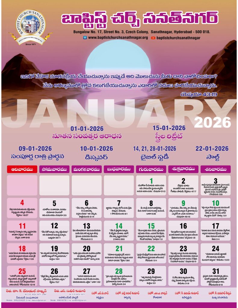 Monthly Bulletin Telugu Calendar 2026 English Calendar 2026 Click Here to Download Previous Month Bulletin Sermons Bible Study SALT (Study and Learn Together) Click Here more Videos
