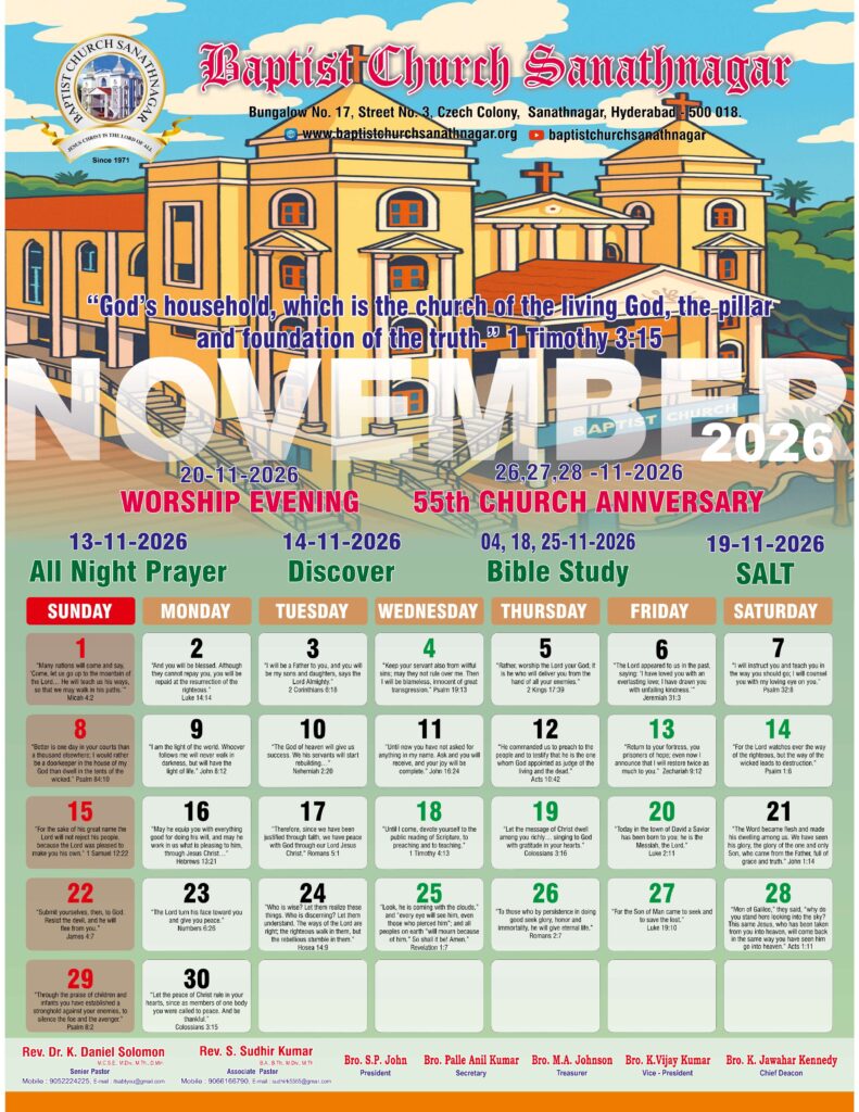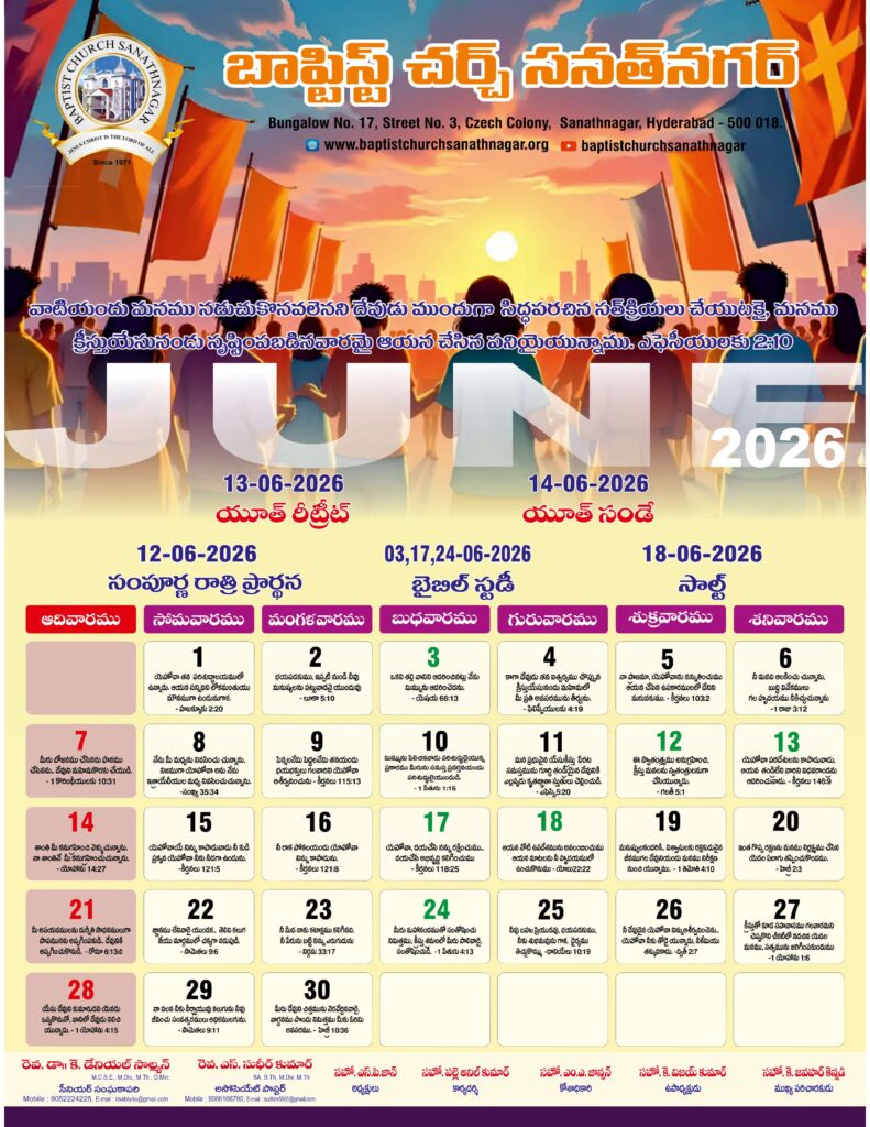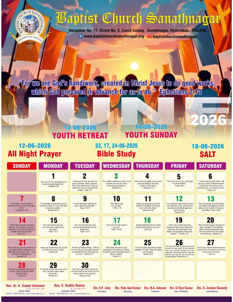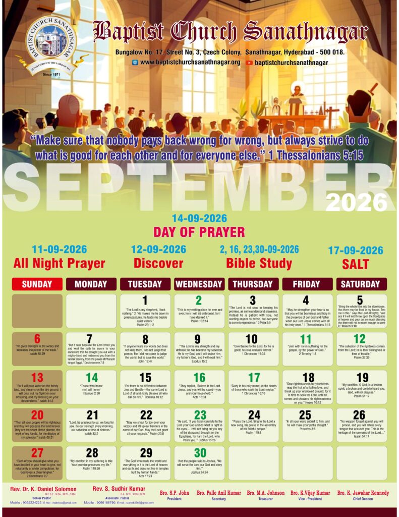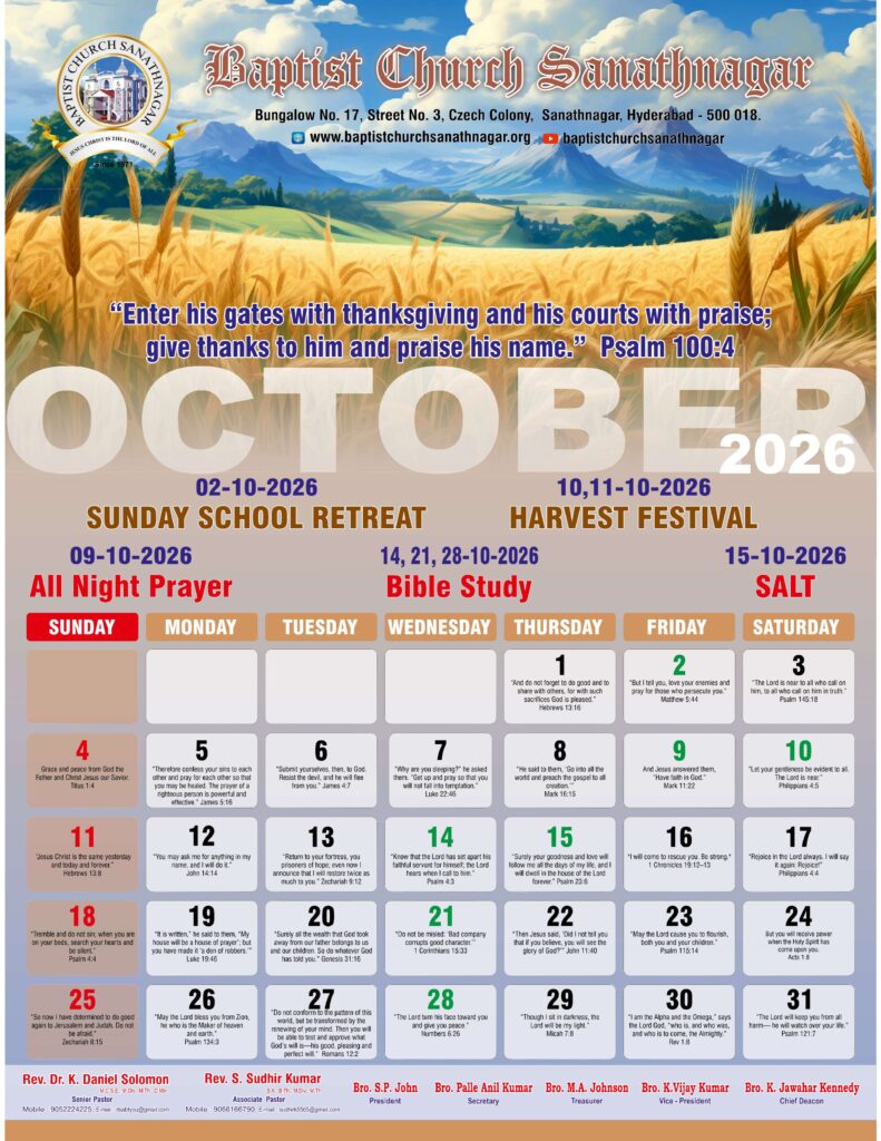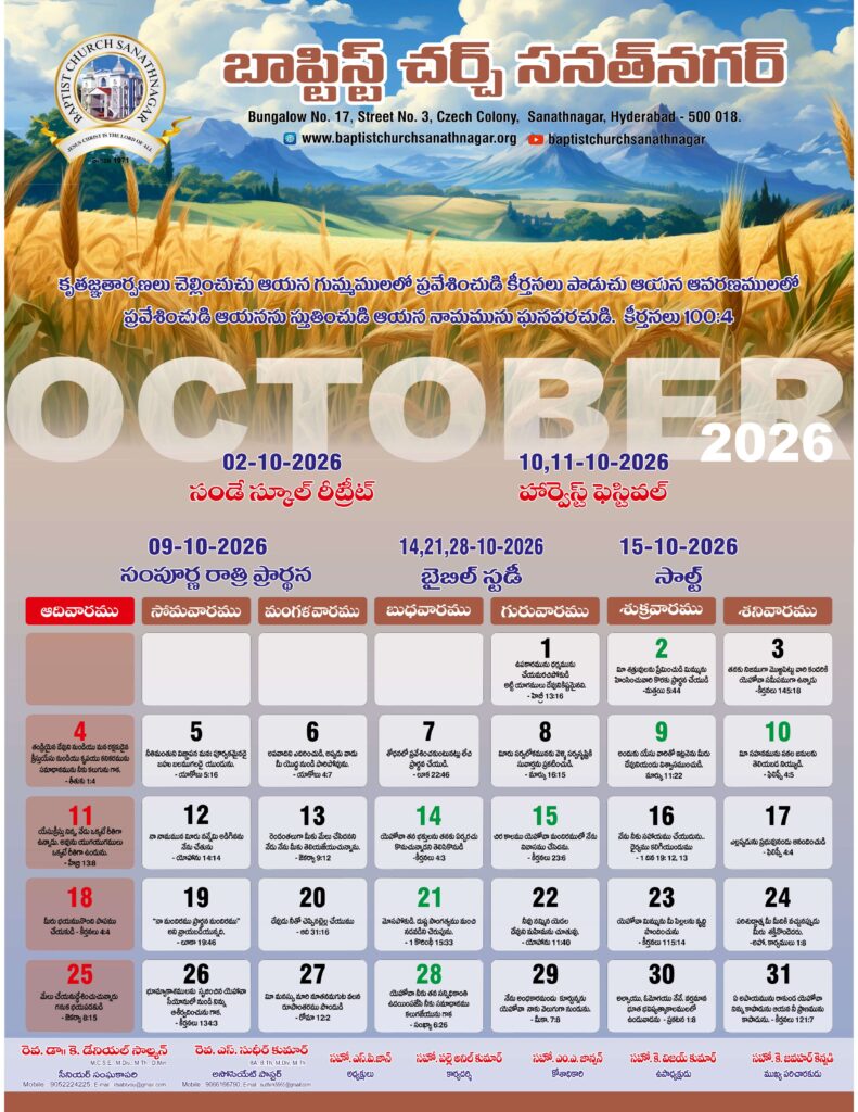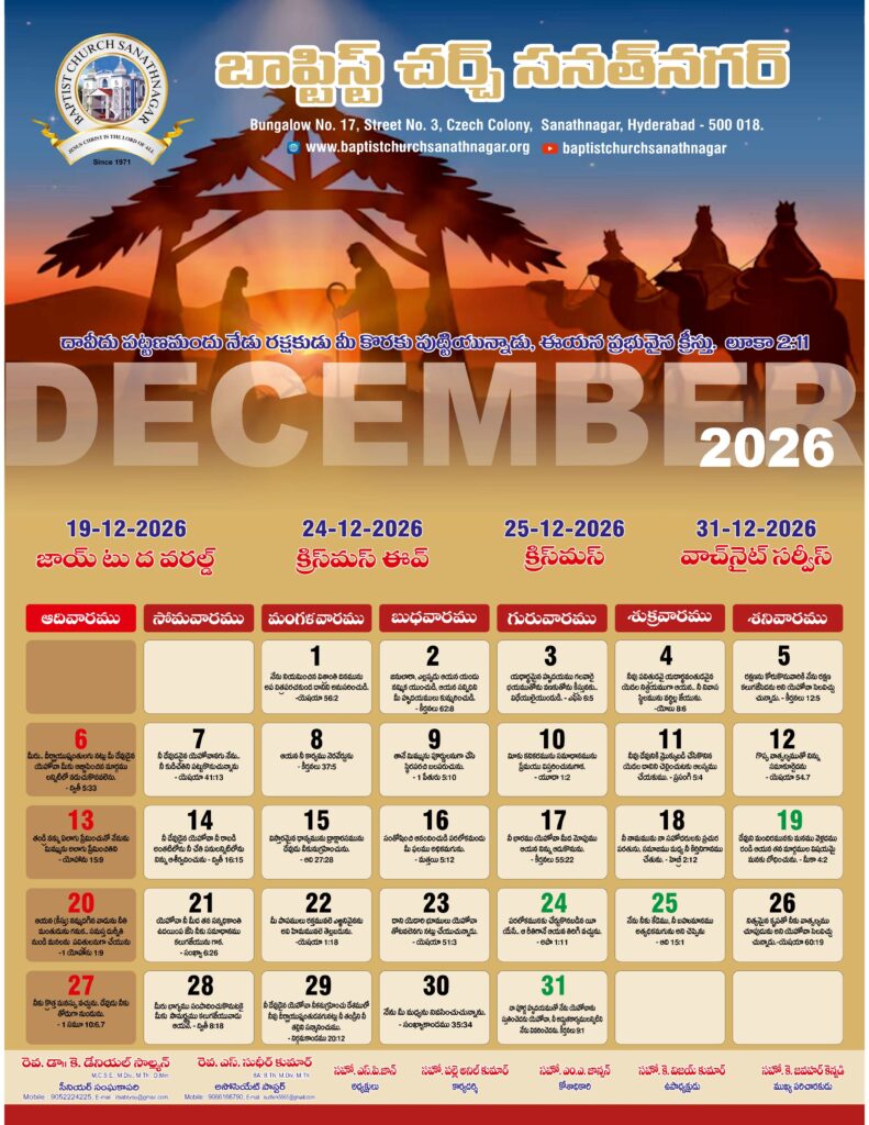 Monthly Bulletin Telugu Calendar 2026 English Calendar 2026 Click Here to Download Previous Month Bulletin Sermons Bible Study SALT (Study and Learn Together) Click Here more Videos