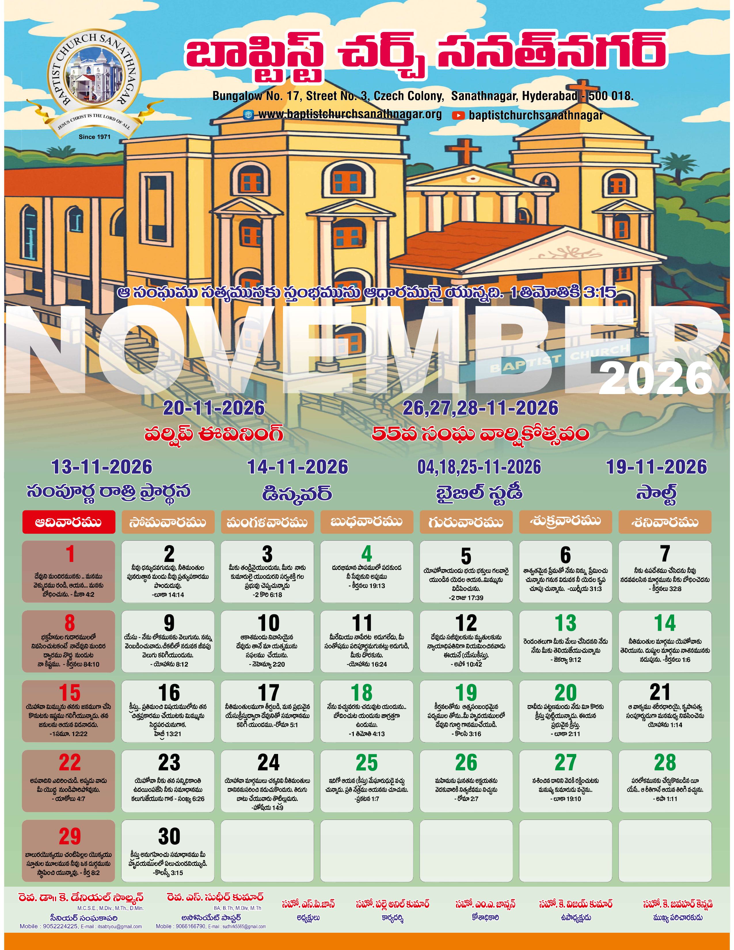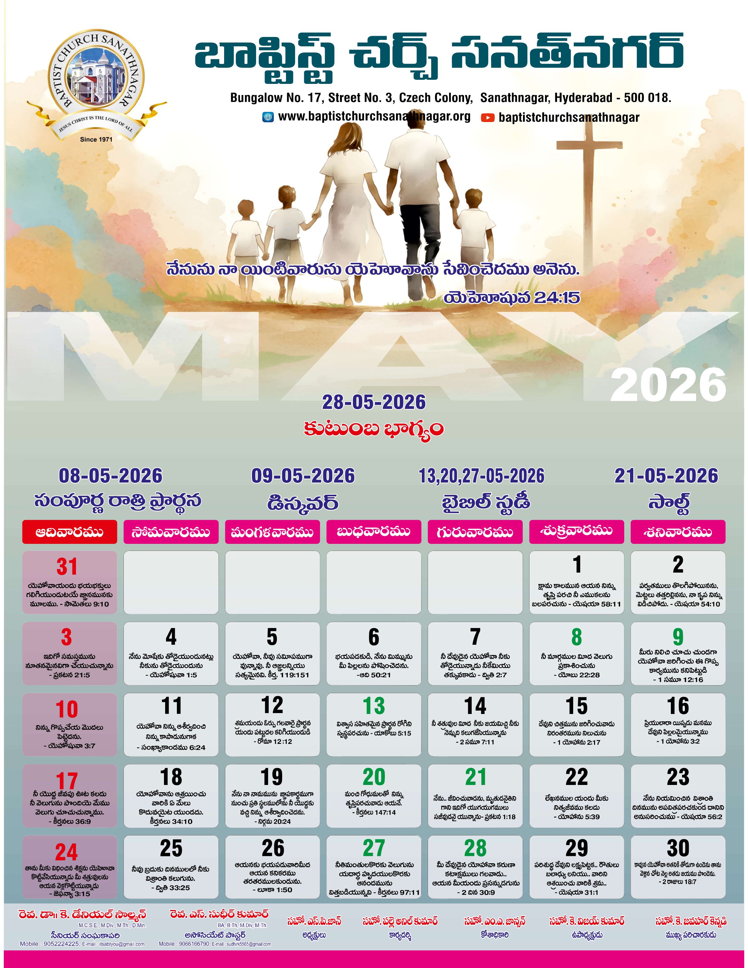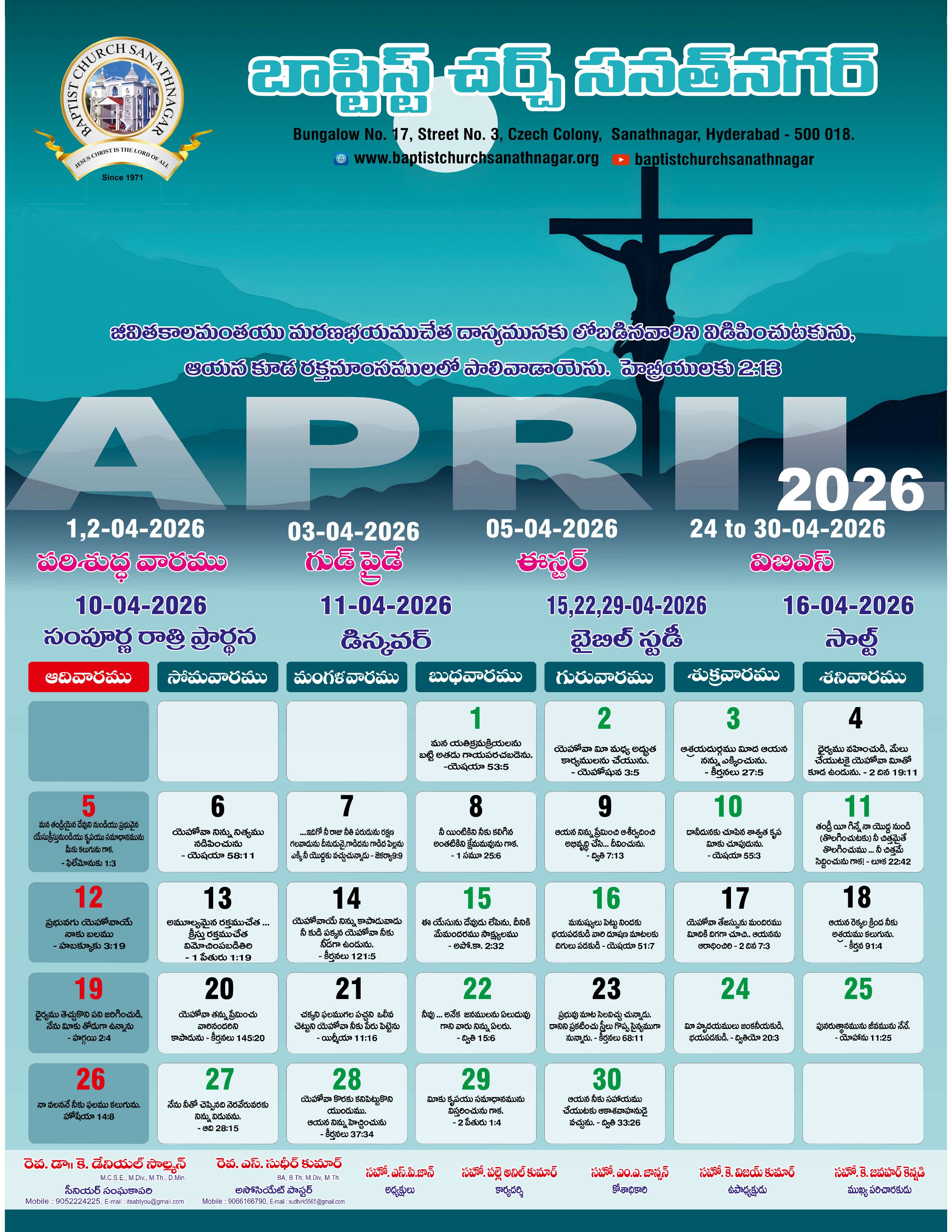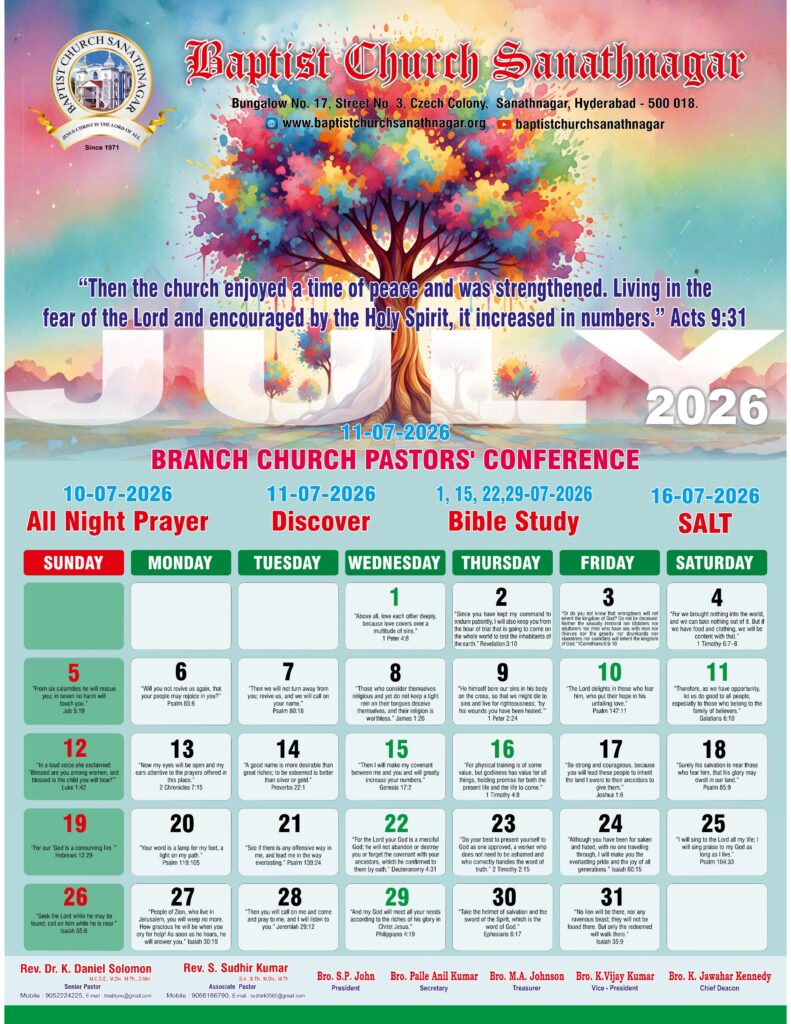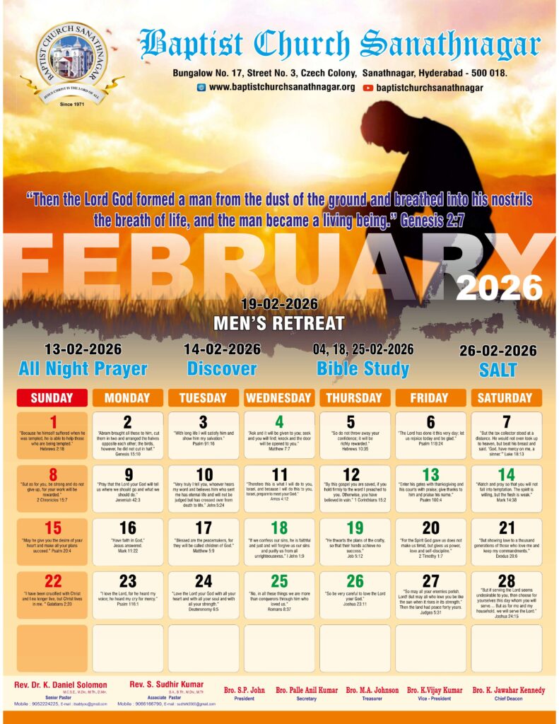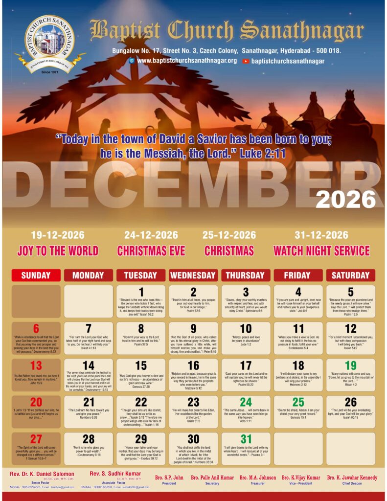 Monthly Bulletin Telugu Calendar 2026 English Calendar 2026 Click Here to Download Previous Month Bulletin Sermons Bible Study SALT (Study and Learn Together) Click Here more Videos